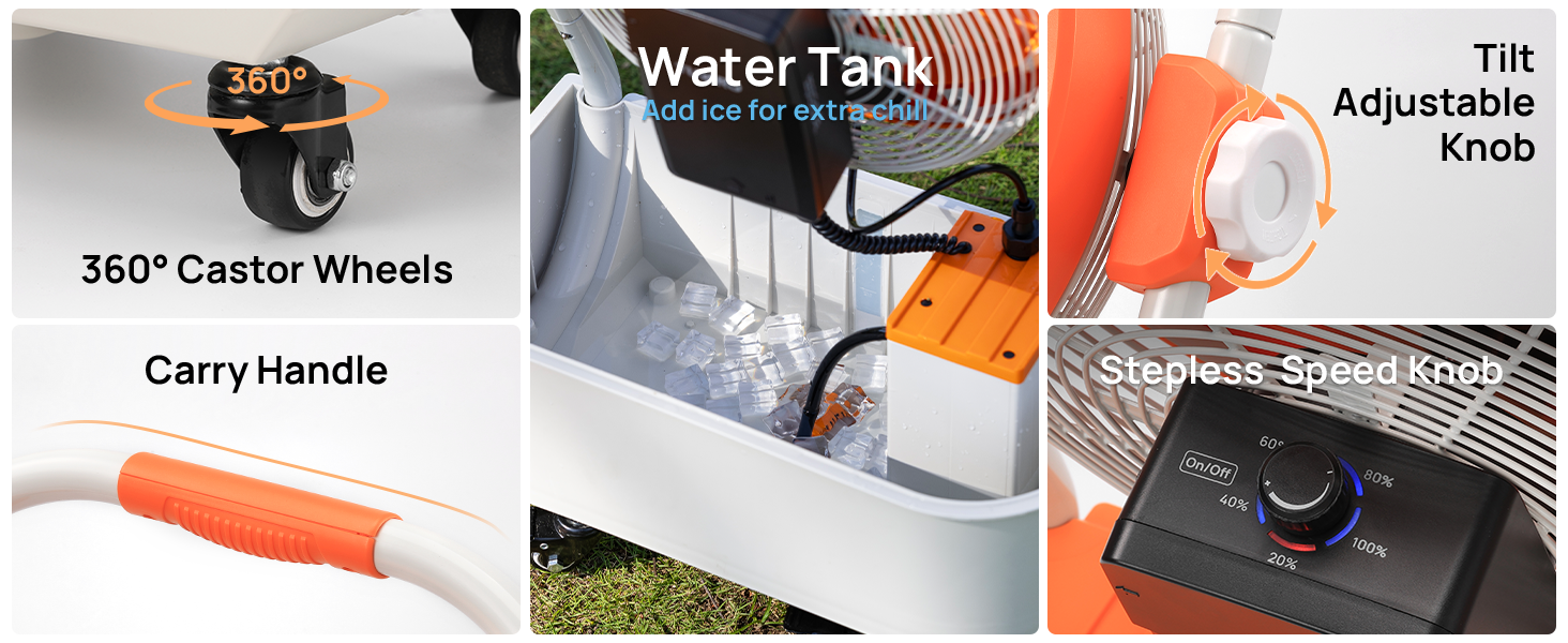 • Powerful airflow and 6L/h mist output cool large outdoor areas fast.