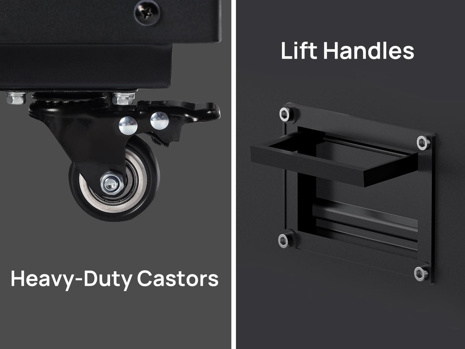 - Heavy-duty casters enable easy movement across hard surfaces, with the two front wheels featuring locks for stability when in storage.