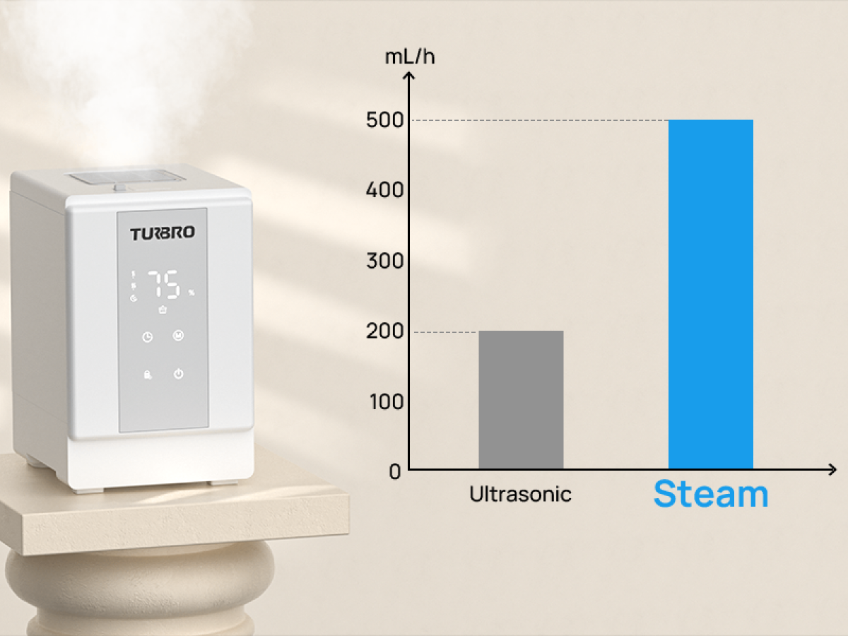Tired of waiting for dry air to improve? With a powerful 500 mL/h mist output, this steam humidifier increases humidity levels nearly 2.5× faster than ultrasonic units (200 mL/h). Enjoy comfortable humidity in just 30–40 minutes.