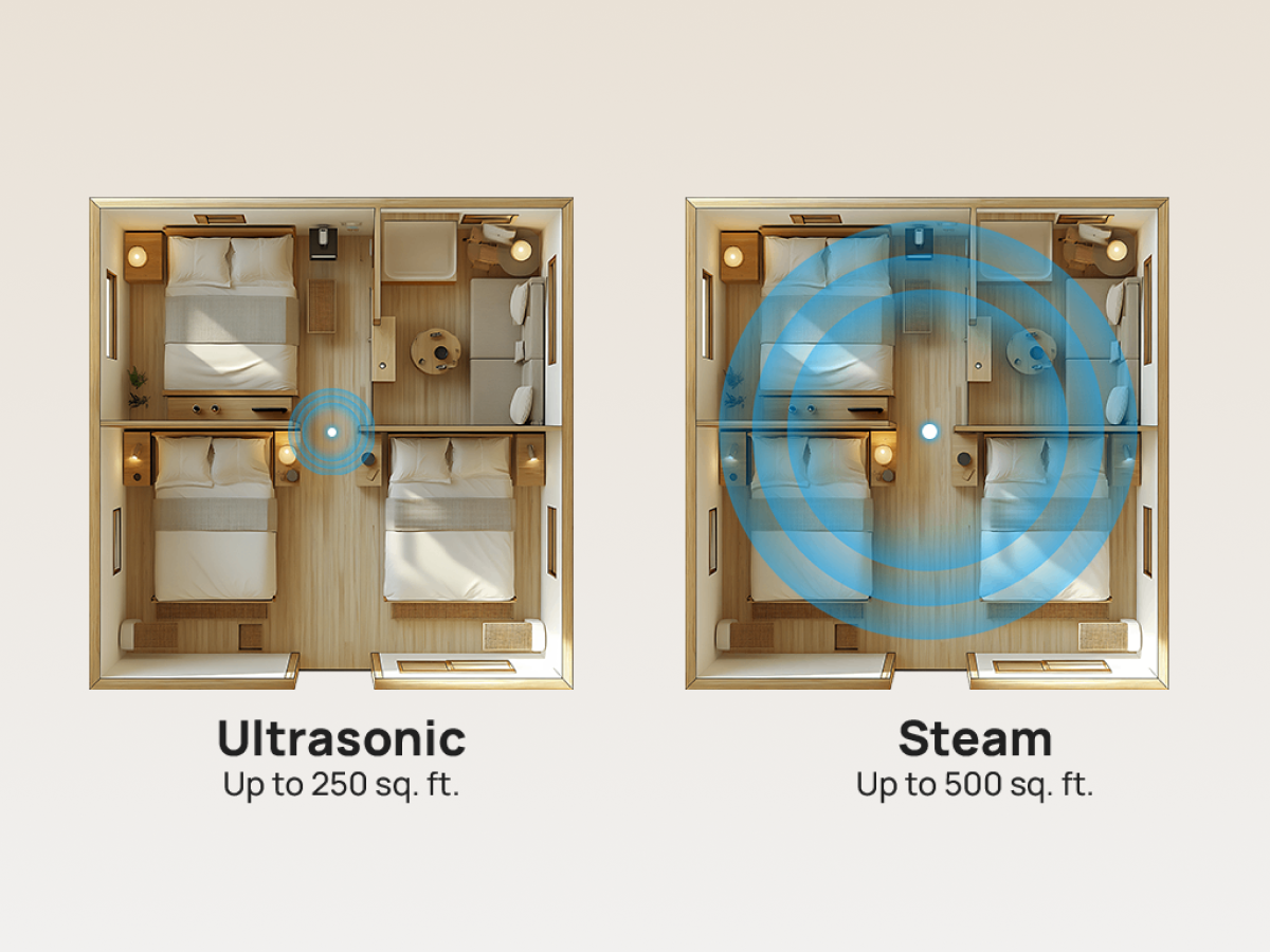 Ultrasonic humidifiers keep mist in a small zone (about 250 sq. ft.). Steam spreads naturally, reaching up to 500 sq. ft., making them ideal for bedrooms, living rooms, or nurseries.