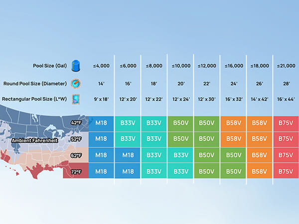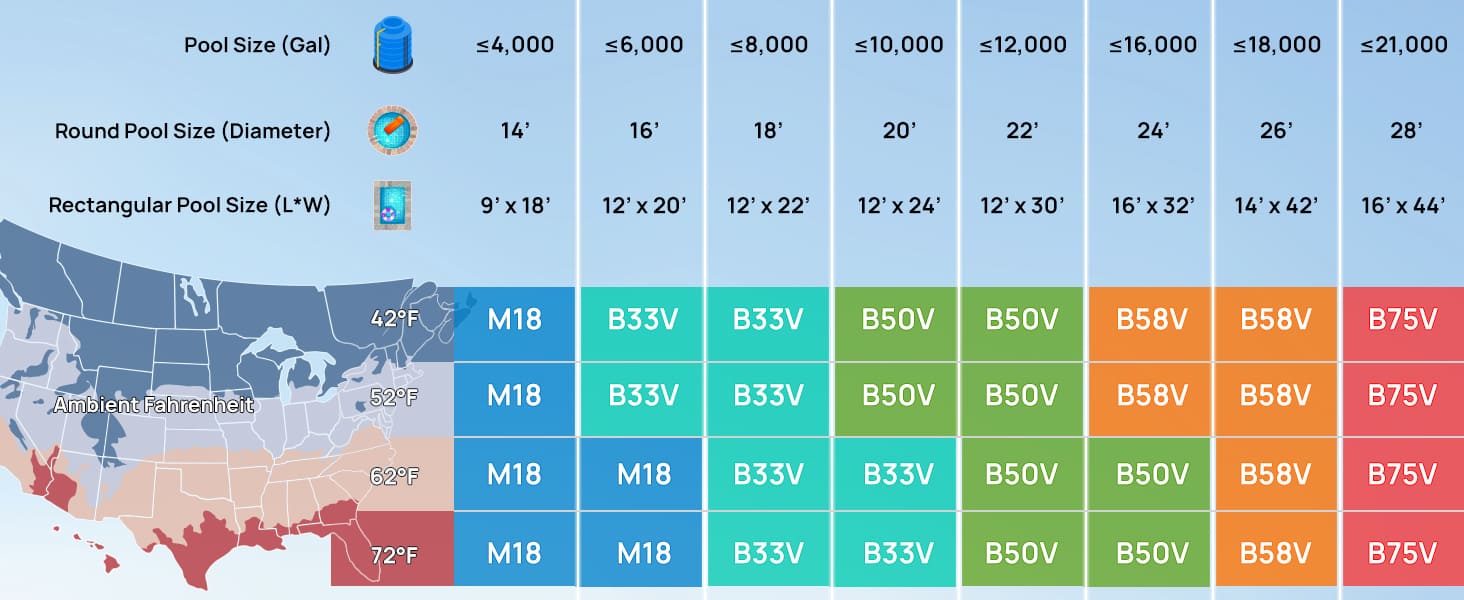 - M18: Fits pools up to 6,000 gallons, including round pools up to 16 ft or rectangular pools up to 12 × 20 ft.